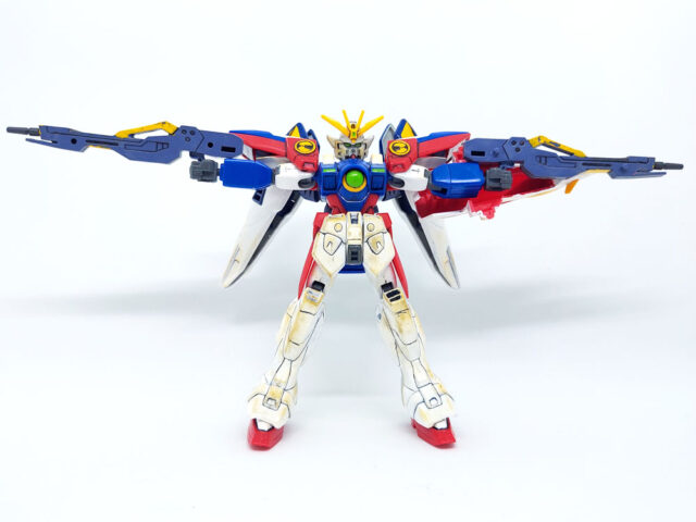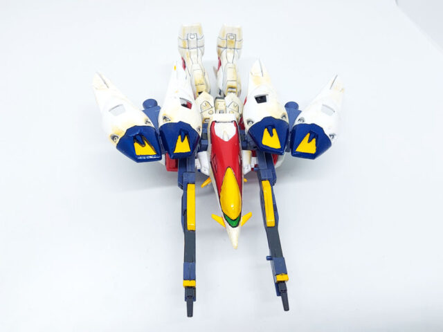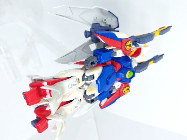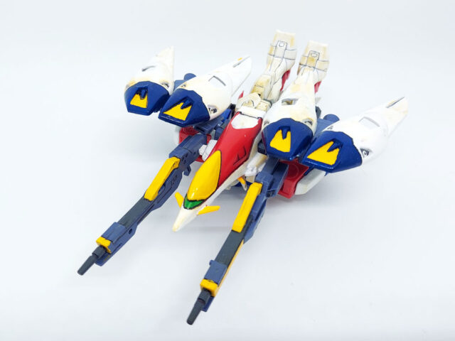 バックパックの羽に付いてるウイングバーニアがこの機体のメインバーニア。モビルスーツ形態時の羽を閉じている状態では、横に付いているウイングスラスターから噴射し、機動性を補助する。